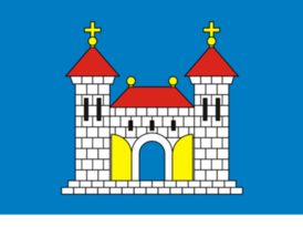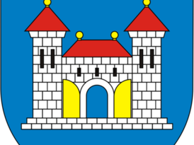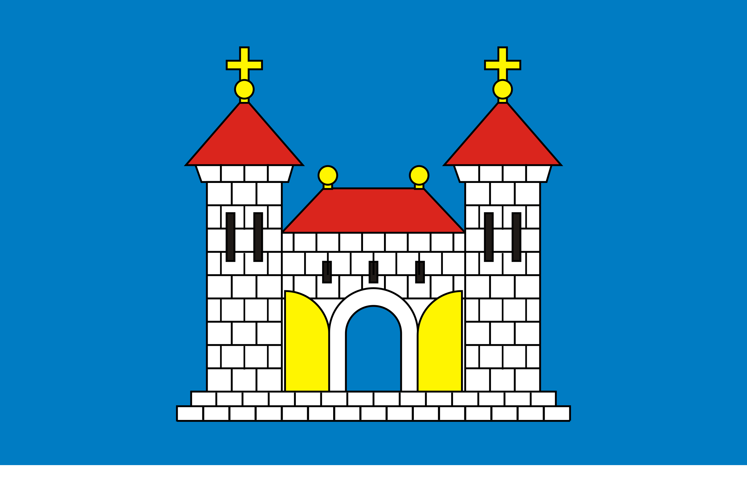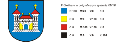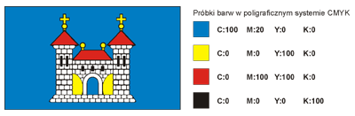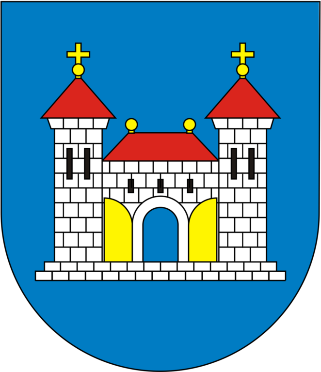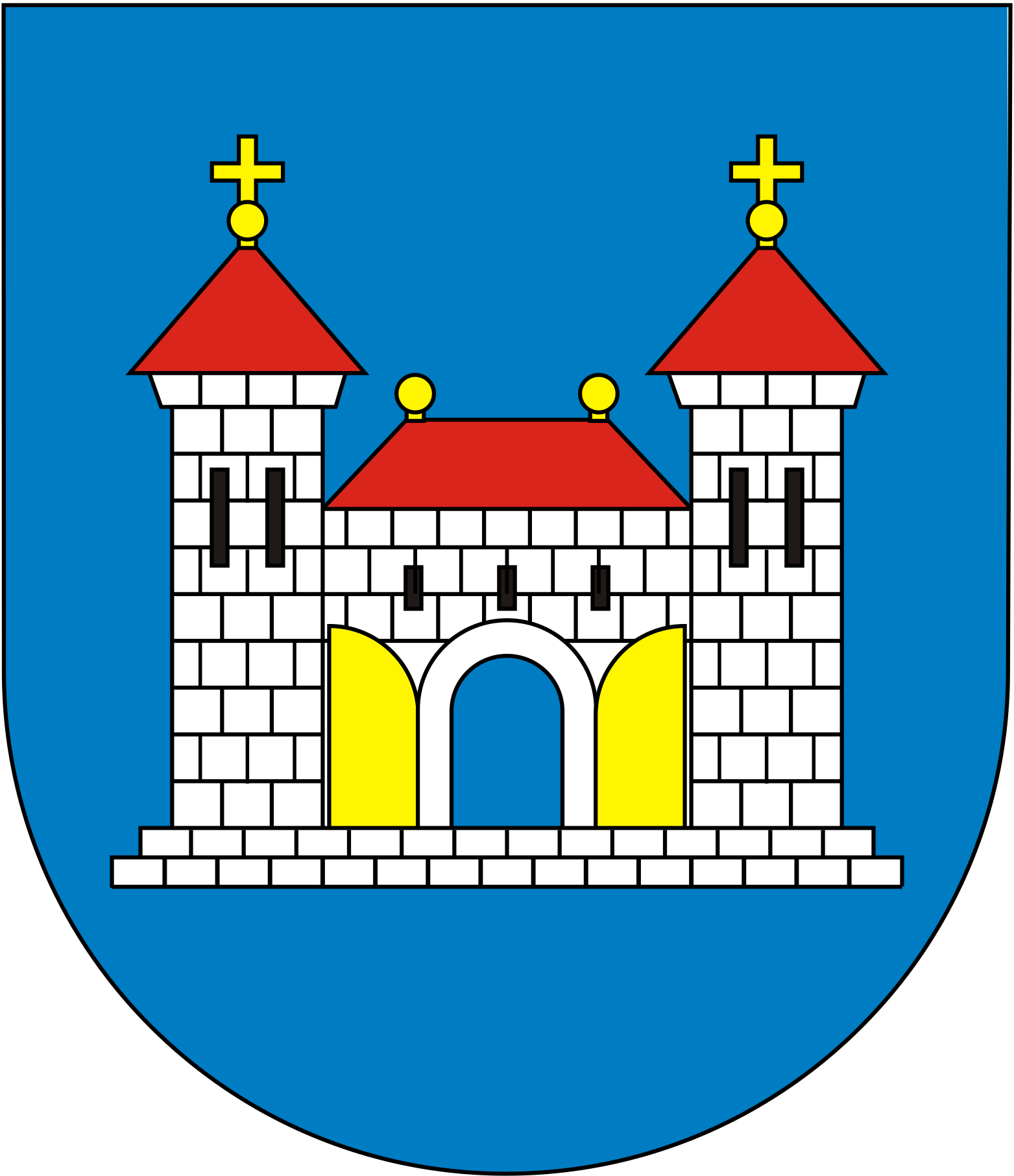 W polu błękitnym srebrne mury z bramą otwartą pośrodku i z dwiema wieżami bocznymi; w każdej wieży po dwa okna prostokątne na wysokości dachu środkowego; nad portalem trzy okna prostokątne, podwoje otwarte złote, nabijane; dachy wież zakończone złotymi gałkami i takimiż krzyżami. Otwory okienne czarne, dachy czerwone, otwór bramy błękitny. Brama połączona jest ze skarpowym fundamentem. Tarcza jest dołem półokrągła.