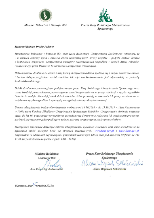 Kontynuacja grupowego ubezpieczenia następstw nieszczęśliwych wypadków i chorób dzieci rolników