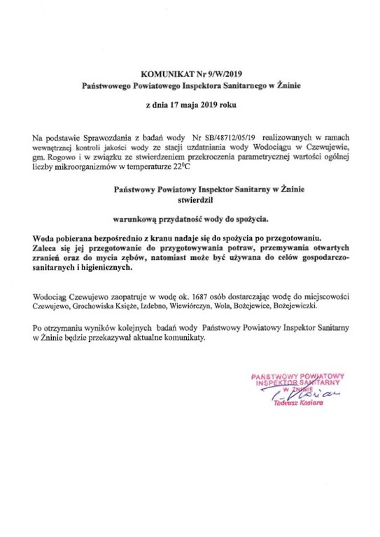 Zachęcamy do zapoznania się z komunikatem dotyczącym stacji uzdatniania wody Wodociągu w Czewujewie.