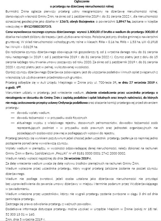 Ogłoszenie o przetargu na dzierżawę nieruchomości rolnej
