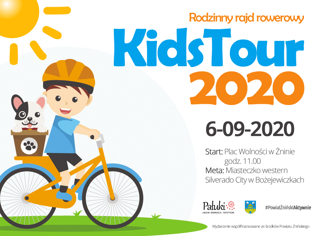 Lokalna Organizacja Turystyczna Pałuki serdecznie zaprasza najmłodszych fanów dwóch kółek wraz z rodzicami/opiekunami do udziału w Rodzinnym Rajdzie Rowerowym KIDS TOUR na dystansie 22 km, który odbędzie się 6 września 2020 r. Rozpoczęcie rajdu zaplanowano na żnińskim rynku o godz. 11.00. Dla zarejestrowanych uczestników wydarzenia przewidziano pakiety startowe, pamiątkowe medale oraz posiłek w miasteczku western Silverado City w Bożejewiczkach, gdzie odbędzie się zakończenie rajdu. Limit miejsc ograniczony - przewiduje się uczestnictwo 50 dzieci wraz z ich rodzicami/opiekunami.