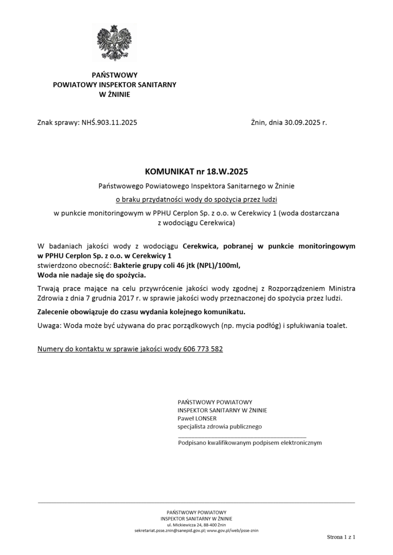 KOMUNIKAT nr 18.W.2025 Państwowego Powiatowego Inspektora Sanitarnego w Żninie o braku przydatności wody do spożycia przez ludzi
